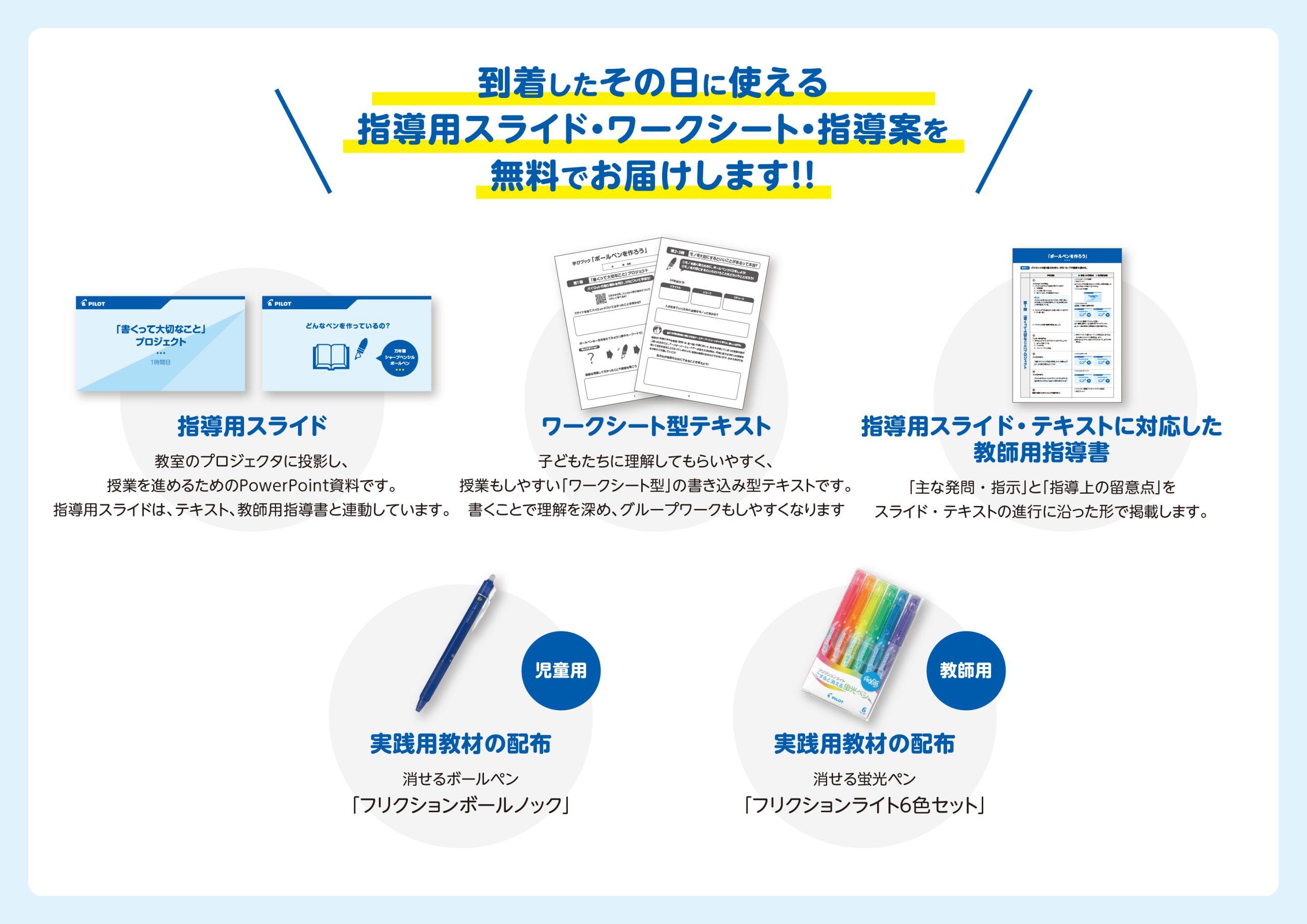 消せるボールペン「フリクションボールノック」を児童一人につき1本お届けいたします(先着100クラス限定)。